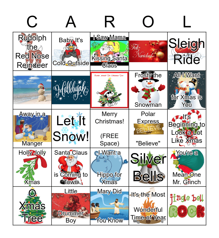 This bingo card has 24 images, a free space and 19 words: Santa Claus is Coming to Town, Little Drummer Boy, O Xmas Tree, Sleigh Ride, Rudolph the Red Nose Reindeer, Baby It's Cold Outside, Polar Express "Believe", I Want a Hippo for Xmas, Frosty the Snowman, Away in a Manger, Silver Bells, You're a Mean One Mr. Grinch, It's the Most Wonderful Time of Year, It's Beginning to Look a Lot Like Xmas, I Saw Mama Kissing Santa Claus, All I Want for Xmas is You, Let It Snow!, Holly Jolly Xmas and Mary Did You Know.