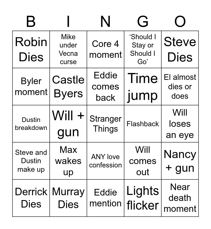 This bingo card has a free space and 24 words: Max wakes up, Murray Dies, Eddie comes back, Derrick Dies, Steve Dies, Robin Dies, Byler moment, Mike under Vecna curse, Flashback, ANY love confession, Time jump, Dustin breakdown, Will comes out, Nancy + gun, Castle Byers, Lights flicker, Will loses an eye, Core 4 moment, El almost dies or does, Will + gun, Near death moment, Steve and Dustin make up, ‘Should I Stay or Should I Go’ and Eddie mention.