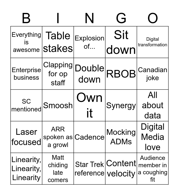 This bingo card has a free space and 24 words: ARR spoken as a growl, Matt chiding late comers, Double down, Linearity, Linearity, Linearity, Digital transformation, Everything is awesome, Enterprise business, Table stakes, Synergy, Cadence, RBOB, SC mentioned, Mocking ADMs, Digital Media love, Clapping for op staff, Content velocity, All about data, Explosion of..., Canadian joke, Smoosh, Audience member in a coughing fit, Laser focused, Sit down and Star Trek reference.