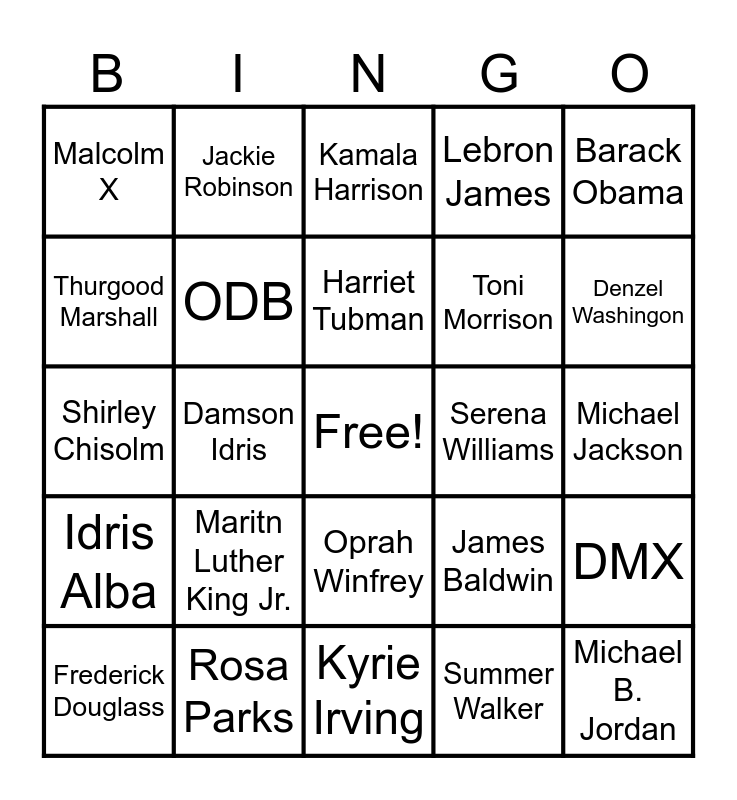 This bingo card has a free space and 24 words: Maritn Luther King Jr., Rosa Parks, Harriet Tubman, Frederick Douglass, Barack Obama, Malcolm X, Thurgood Marshall, Jackie Robinson, Serena Williams, Oprah Winfrey, Toni Morrison, Shirley Chisolm, James Baldwin, DMX, ODB, Summer Walker, Michael Jackson, Kamala Harrison, Denzel Washingon, Damson Idris, Michael B. Jordan, Idris Alba, Lebron James and Kyrie Irving.