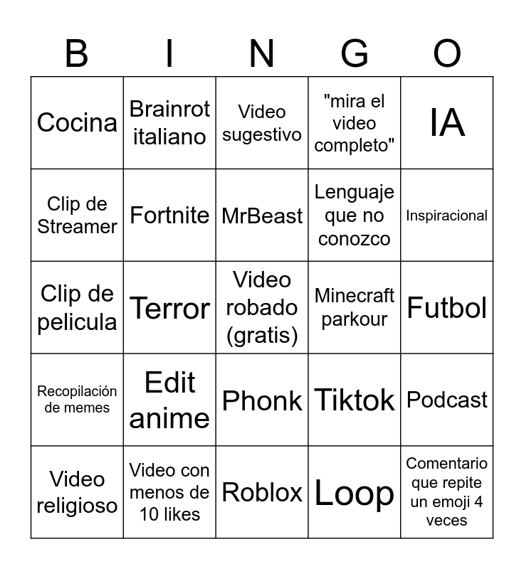 This bingo card has a free space and 24 words: Edit anime, Video con menos de 10 likes, MrBeast, Video religioso, IA, Cocina, Clip de Streamer, Brainrot italiano, Minecraft parkour, Phonk, Lenguaje que no conozco, Clip de pelicula, Tiktok, Podcast, Fortnite, Loop, Futbol, Video sugestivo, Inspiracional, Terror, Comentario que repite un emoji 4 veces, Recopilación de memes, "mira el video completo" and Roblox.