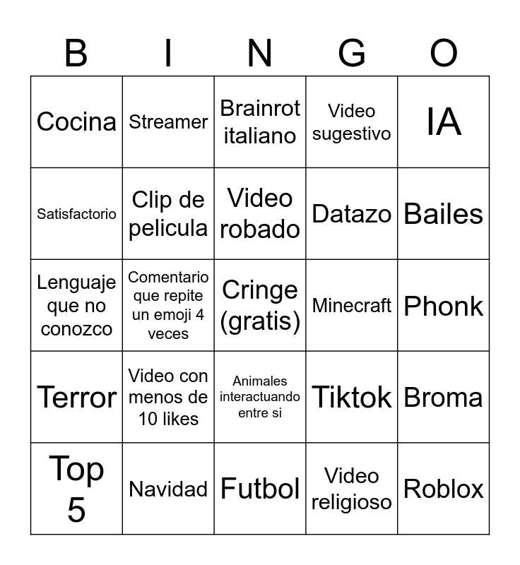 This bingo card has a free space and 24 words: Top 5, Video con menos de 10 likes, Video robado, Video religioso, IA, Cocina, Streamer, Brainrot italiano, Minecraft, Phonk, Lenguaje que no conozco, Clip de pelicula, Tiktok, Broma, Satisfactorio, Navidad, Futbol, Video sugestivo, Bailes, Terror, Comentario que repite un emoji 4 veces, Animales interactuando entre si, Datazo and Roblox.