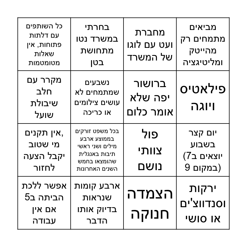 This bingo card has 16 words: ארבע קומות שנראות בדיוק אותו הדבר, יום קצר בשבוע (יוצאים ב7 במקום 9), מחברת ועט עם לוגו של המשרד, כל השותפים עם דלתות פתוחות, אין שאלות מטומטמות, אין תקנים, מי שטוב יקבל הצעה לחזור, בחרתי במשרד נטו מתחושת בטן, פול צוותי נושם, הצמדה חנוקה, מקרר עם חלב שיבולת שועל, נשבעים שמתמחים לא עושים צילומים או כריכה, אפשר ללכת הביתה ב5 אם אין עבודה, מביאים מתמחים רק מהייטק ומליטיגציה, בכל משפט זורקים בממוצע ארבע מילים ושני ראשי תיבות באנגלית שהומצאו בחמש השנים האחרונות, פילאטיס ויוגה, ברושור יפה שלא אומר כלום and ירקות וסנדווצ'ים או סושי.