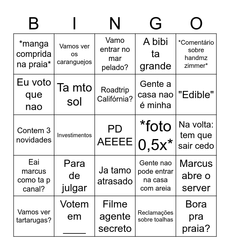 This bingo card has a free space and 27 words: Gente nao pode entrar na casa com areia, Bolao da copa, Gente a casa nao é minha, Filme agente secreto, Eu voto que nao, Vamo entrar no mar pelado?, Vamos ver os caranguejos, Eai marcus como ta p canal?, *foto 0,5x*, Marcus abre o server, Contem 3 novidades, A bibi ta grande, Vamos ver tartarugas?, Votem em ____, "Edible", E o parmera?, Ta mto sol, Roadtrip Califórnia?, Para de julgar, *manga comprida na praia*, Na volta: tem que sair cedo, Reclamações sobre toalhas, Investimentos, Bora pra praia?, Ja tamo atrasado, *Comentário sobre handmz zimmer* and Eu discordo.