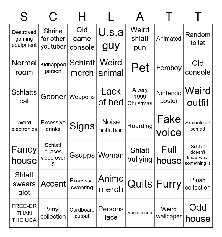 This bingo card has 49 words: Furry, Femboy, Alcohol/cigarettes, Excessive drinks, Weapons, Sexualized schlatt, Shrine for other youtuber, Cardboard cutout, Animated, Woman, Random toilet, U.s.a guy, Nintendo poster, A very 1999 Christmas, Accent, Fake voice, Normal room, Old console, Plush collection, Weird shlatt pun, Pet, Signs, Destroyed gaming equipment, Kidnapped person, FREE-ER THAN THE USA, Schlatt merch, Weird outfit, Vinyl collection, Lack of bed, Gooner, Odd house, Hoarding, Shlatt swears alot, Excessive swearing, Weird electronics, Shlatt bullying, Full house, Schlatt doesn't know what something is, Schlatts cat, Gsupps, Anime merch, Fancy house, Noise pollution, Persons face, Weird animal, Old game console, Quits, Schlatt puases video over 5 and Weird wallpaper.