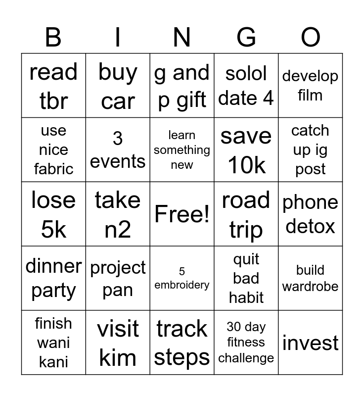 This bingo card has a free space and 24 words: project pan, visit kim, learn something new, finish wani kani, develop film, read tbr, use nice fabric, buy car, road trip, 5 embroidery, save 10k, lose 5k, quit bad habit, build wardrobe, 3 events, 30 day fitness challenge, phone detox, g and p gift, catch up ig post, take n2, invest, dinner party, solol date 4 and track steps.