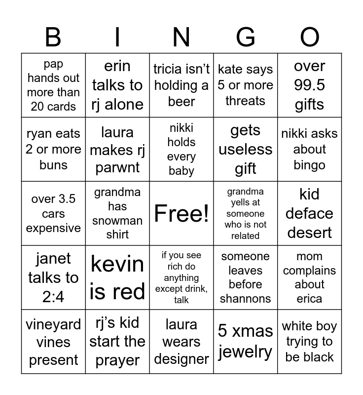 This bingo card has a free space and 29 words: vineyard vines present, mom says she’s hot, grandma has snowman shirt, the last person there is michael, pap hands out more than 20 cards, tricia isn’t holding a beer, laura makes rj parwnt, kevin is red, grandma yells at someone who is not related, rj’s kid start the prayer, kid deface desert, white boy trying to be black, laura wears designer, 5 xmas jewelry, nikki asks about bingo, david wears a hat at dinner, if you see rich do anything except drink, talk, janet talks to 2:4, over 99.5 gifts, over 3.5 cars expensive, someone leaves before shannons, a theme present, gets useless gift, ryan eats 2 or more buns, kate says 5 or more threats, erin talks to rj alone, mom complains about erica, nikki holds every baby and it’s cold.