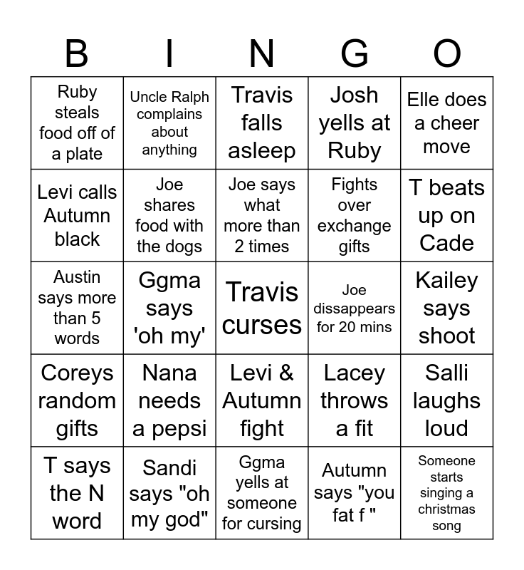 This bingo card has a free space and 29 words: T says the N word, Aubrey sits on Chase's lap, Ggma says 'oh my', Someone asks Alayna about college, Ruby steals food off of a plate, Travis falls asleep, Joe shares food with the dogs, Nana needs a pepsi, Joe dissappears for 20 mins, Sandi says "oh my god", Kailey says shoot, Someone starts singing a christmas song, Ggma yells at someone for cursing, Autumn says "you fat f ", T beats up on Cade, Someone asks Carly about Italy, Levi & Autumn fight, Coreys random gifts, Elle does a cheer move, Austin says more than 5 words, Lacey throws a fit, Someone fat shames Ruby, Fights over exchange gifts, Levi calls Autumn black, Josh yells at Ruby, Uncle Ralph complains about anything, Salli laughs loud, Joe says what more than 2 times and Niki says WTF!.