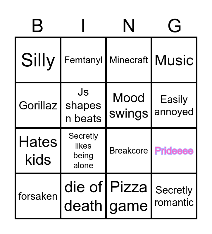 This bingo card has 16 words: forsaken, die of death, Minecraft, Music, Gorillaz, Femtanyl, Breakcore, Prideeee, Silly, Js shapes n beats, Pizza game, Easily annoyed, Hates kids, Secretly likes being alone, Mood swings and Secretly romantic.
