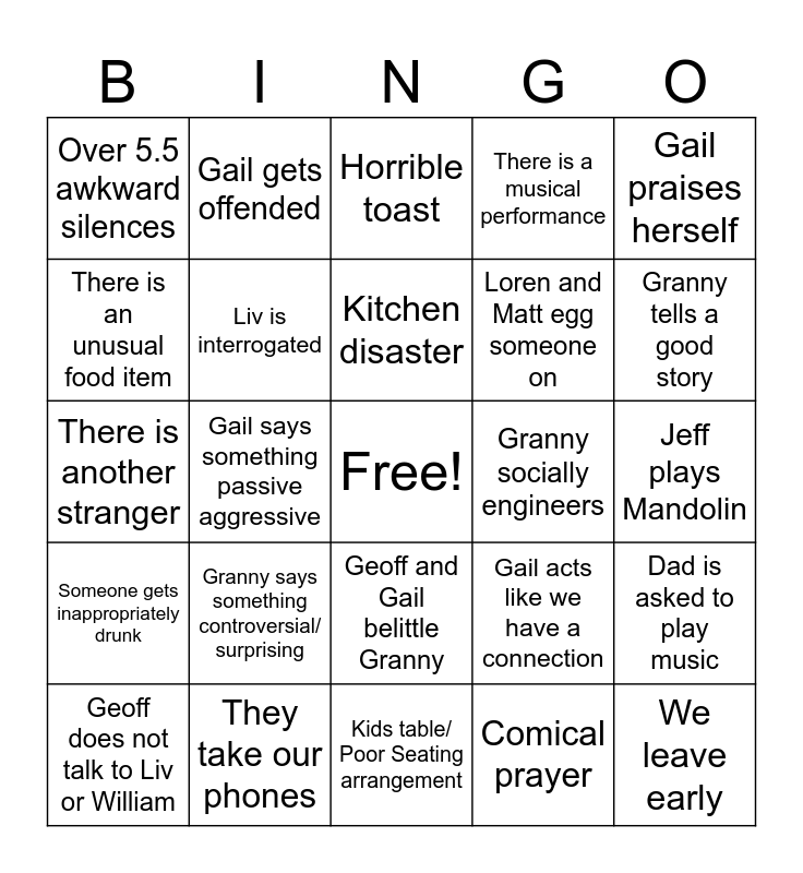 This bingo card has a free space and 24 words: Granny says something controversial/ surprising, They take our phones, Kitchen disaster, Geoff does not talk to Liv or William, Gail praises herself, Over 5.5 awkward silences, There is an unusual food item, Gail gets offended, Granny socially engineers, Geoff and Gail belittle Granny, Loren and Matt egg someone on, There is another stranger, Gail acts like we have a connection, Dad is asked to play music, Liv is interrogated, Comical prayer, Jeff plays Mandolin, Horrible toast, Granny tells a good story, Gail says something passive aggressive, We leave early, Someone gets inappropriately drunk, There is a musical performance and Kids table/ Poor Seating arrangement.