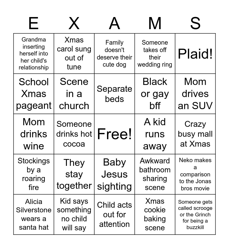 This bingo card has a free space and 24 words: They stay together, Kid says something no child will say, Separate beds, Alicia Silverstone wears a santa hat, Plaid!, Grandma inserting herself into her child's relationship, School Xmas pageant, Xmas carol sung out of tune, A kid runs away, Baby Jesus sighting, Black or gay bff, Mom drinks wine, Awkward bathroom sharing scene, Neko makes a comparison to the Jonas bros movie, Scene in a church, Xmas cookie baking scene, Crazy busy mall at Xmas, Family doesn't deserve their cute dog, Mom drives an SUV, Someone drinks hot cocoa, Someone gets called scrooge or the Grinch for being a buzzkill, Stockings by a roaring fire, Someone takes off their wedding ring and Child acts out for attention.