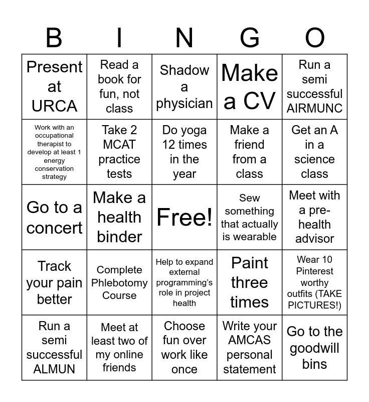 This bingo card has a free space and 24 words: Complete Phlebotomy Course, Meet at least two of my online friends, Do yoga 12 times in the year, Run a semi successful ALMUN, Run a semi successful AIRMUNC, Present at URCA, Work with an occupational therapist to develop at least 1 energy conservation strategy, Read a book for fun, not class, Sew something that actually is wearable, Help to expand external programming’s role in project health, Make a friend from a class, Go to a concert, Paint three times, Wear 10 Pinterest worthy outfits (TAKE PICTURES!), Take 2 MCAT practice tests, Write your AMCAS personal statement, Meet with a pre-health advisor, Shadow a physician, Get an A in a science class, Make a health binder, Go to the goodwill bins, Track your pain better, Make a CV and Choose fun over work like once.