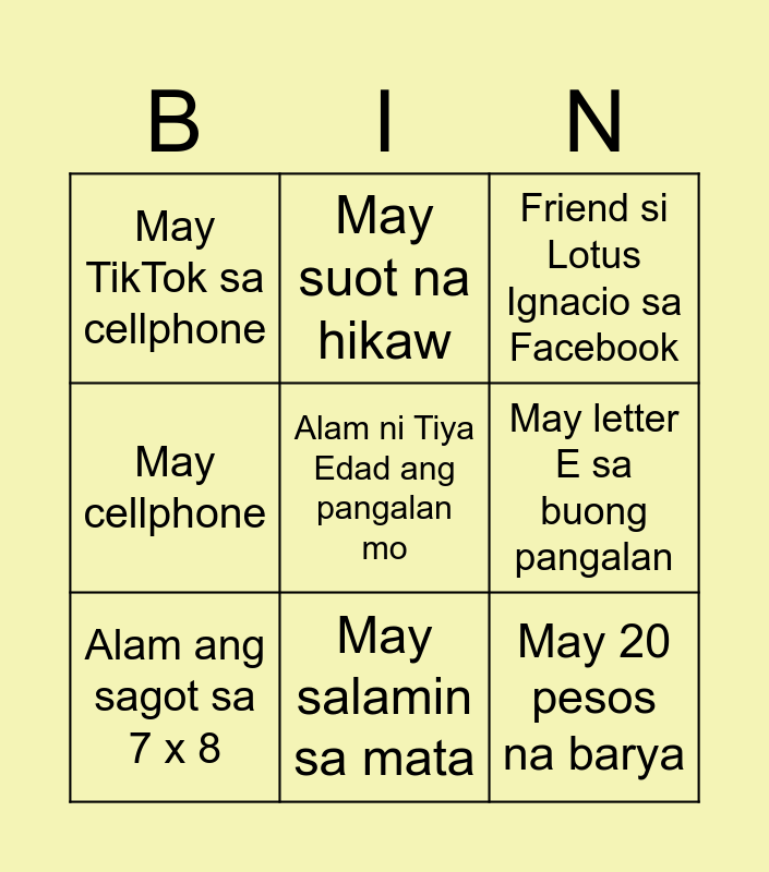 This bingo card has a free space and 28 words: May bungi, Humihilik ang Tatay mo, May 10 pesos na puro piso, May alagang hayop sa bahay, May letter E sa buong pangalan, Friend si Lotus Ignacio sa Facebook, May suot na hikaw, Natapos na ang birthday ngayong taon, Alam ang sagot sa 2 + 2, Natae sa short nung bata, Kilala si Alyas 'Badgets', May cellphone, Kumain na ng kanin, Alam ang Tagalog ng reunion, May letter A sa buong pangalan, Kilala si Alyas 'Balot', May 1 kilala sa BINI, Alam ang sagot sa 7 x 8, May salamin sa mata, Naka white na damit, May TikTok sa cellphone, May picture niya sa Profile Picture sa FB, Friend si Gidan Young sa Facebook, May suot na bra, Nakasuot ng brief, Nakasuot ng tsinelas, May 20 pesos na barya and May puting buhok.
