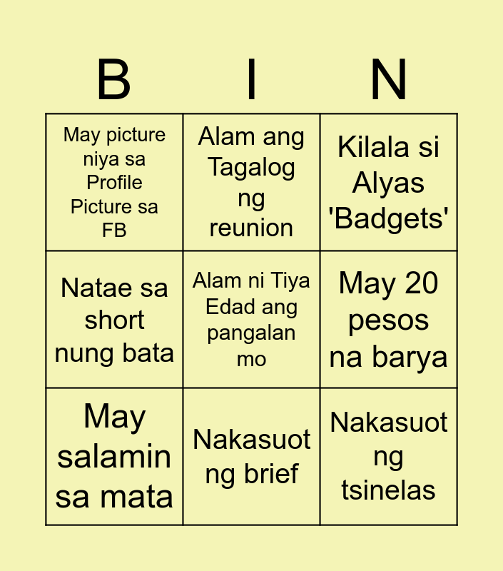 This bingo card has a free space and 28 words: Friend si Gidan Young sa Facebook, May bungi, Friend si Lotus Ignacio sa Facebook, May 10 pesos na puro piso, May 20 pesos na barya, Kilala si Alyas 'Badgets', Alam ang Tagalog ng reunion, May alagang hayop sa bahay, May letter E sa buong pangalan, Kumain na ng kanin, Humihilik ang Tatay mo, Natae sa short nung bata, Alam ang sagot sa 7 x 8, Naka white na damit, Natapos na ang birthday ngayong taon, May letter A sa buong pangalan, May 1 kilala sa BINI, May salamin sa mata, Nakasuot ng brief, May suot na hikaw, May picture niya sa Profile Picture sa FB, May cellphone, May puting buhok, Alam ang sagot sa 2 + 2, May suot na bra, May TikTok sa cellphone, Nakasuot ng tsinelas and Kilala si Alyas 'Balot'.
