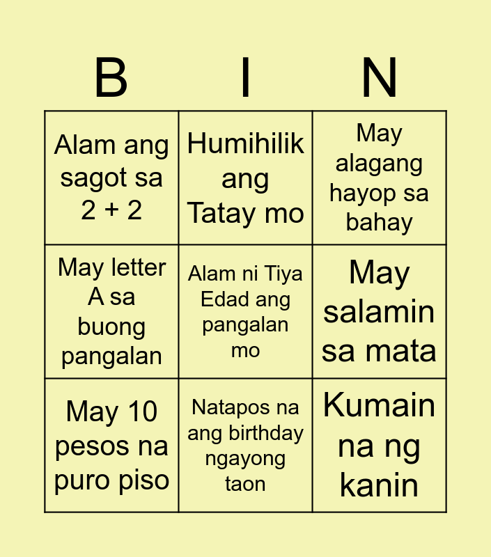 This bingo card has a free space and 28 words: May picture niya sa Profile Picture sa FB, May puting buhok, Nakasuot ng tsinelas, Nakasuot ng brief, May salamin sa mata, May alagang hayop sa bahay, Humihilik ang Tatay mo, May 1 kilala sa BINI, May 20 pesos na barya, May suot na bra, Alam ang Tagalog ng reunion, May letter A sa buong pangalan, May cellphone, Alam ang sagot sa 7 x 8, Natae sa short nung bata, Kilala si Alyas 'Badgets', Friend si Lotus Ignacio sa Facebook, May 10 pesos na puro piso, Natapos na ang birthday ngayong taon, May letter E sa buong pangalan, Alam ang sagot sa 2 + 2, May bungi, May suot na hikaw, Naka white na damit, Friend si Gidan Young sa Facebook, Kilala si Alyas 'Balot', Kumain na ng kanin and May TikTok sa cellphone.