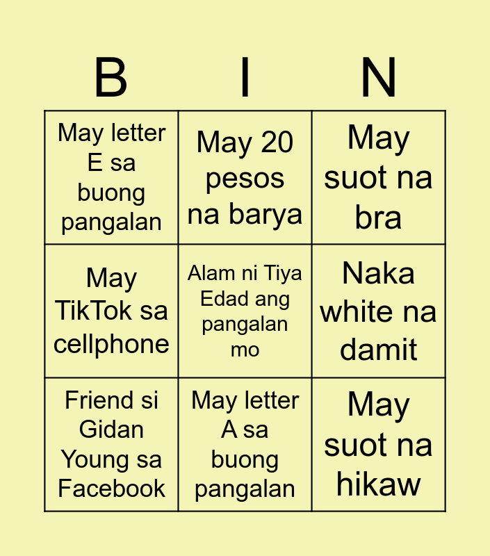 This bingo card has a free space and 28 words: Friend si Lotus Ignacio sa Facebook, Alam ang sagot sa 2 + 2, Kumain na ng kanin, May puting buhok, Naka white na damit, May suot na bra, May 20 pesos na barya, May cellphone, Nakasuot ng tsinelas, Alam ang Tagalog ng reunion, May salamin sa mata, May TikTok sa cellphone, Natapos na ang birthday ngayong taon, Kilala si Alyas 'Balot', May alagang hayop sa bahay, Kilala si Alyas 'Badgets', Alam ang sagot sa 7 x 8, Friend si Gidan Young sa Facebook, May letter A sa buong pangalan, May bungi, May letter E sa buong pangalan, May 1 kilala sa BINI, Natae sa short nung bata, May picture niya sa Profile Picture sa FB, Humihilik ang Tatay mo, May 10 pesos na puro piso, May suot na hikaw and Nakasuot ng brief.