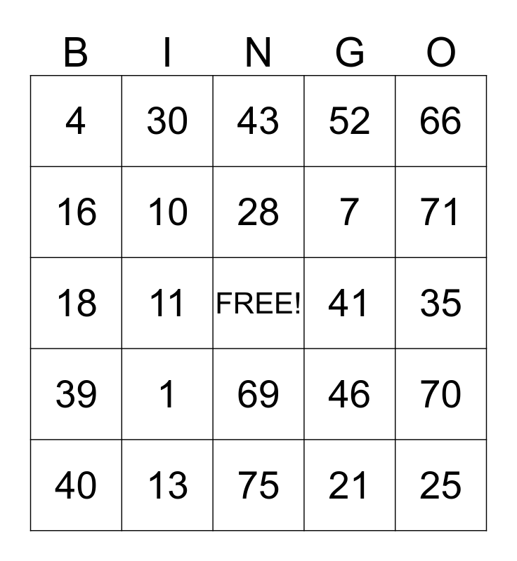 This bingo card has a free space and 24 words: 1, 13, 28, 40, 66, 4, 16, 30, 41, 69, 7, 18, 46, 70, 10, 21, 35, 43, 71, 11, 25, 39, 52 and 75.