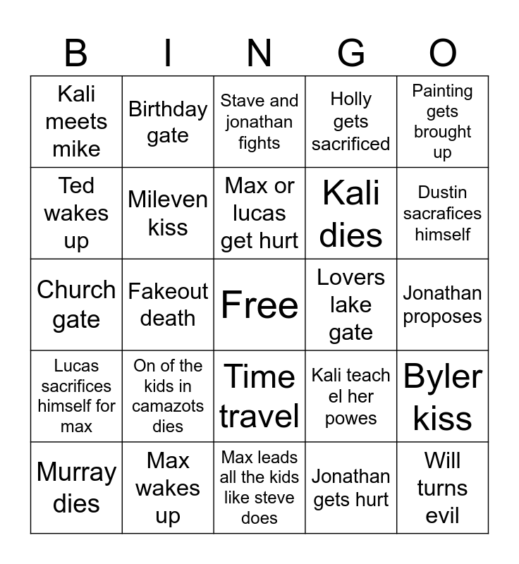 This bingo card has a free space and 24 words: On of the kids in camazots dies, Max wakes up, Max or lucas get hurt, Murray dies, Painting gets brought up, Kali meets mike, Ted wakes up, Birthday gate, Lovers lake gate, Time travel, Kali dies, Church gate, Kali teach el her powes, Byler kiss, Mileven kiss, Jonathan gets hurt, Jonathan proposes, Stave and jonathan fights, Dustin sacrafices himself, Fakeout death, Will turns evil, Lucas sacrifices himself for max, Holly gets sacrificed and Max leads all the kids like steve does.