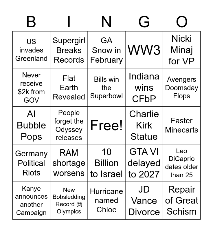 This bingo card has a free space and 24 words: RAM shortage worsens, New Bobsledding Record @ Olympics, Bills win the Superbowl, Kanye announces another Campaign, Nicki Minaj for VP, US invades Greenland, Never receive $2k from GOV, Supergirl Breaks Records, Charlie Kirk Statue, 10 Billion to Israel, Indiana wins CFbP, AI Bubble Pops, GTA VI delayed to 2027, Leo DiCaprio dates older than 25, Flat Earth Revealed, JD Vance Divorce, Faster Minecarts, GA Snow in February, Avengers Doomsday Flops, People forget the Odyssey releases, Repair of Great Schism, Germany Political Riots, WW3 and Hurricane named Chloe.