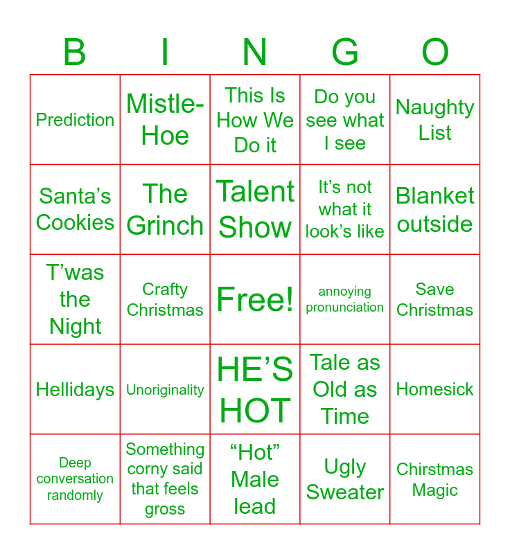 This bingo card has a free space and 64 words: eunited, Holiday Greetings, Santa’s My Homie, Homesick, Theater Reject, Uncharted Wonderlands, Mistle-Hoe, Bewreathed, Talent Show, Deck the Halls, HE’S HOT, Hark the Herald, Save Christmas, Naughty List, Hippy, Santa’s Cookies, Crafty Christmas, Prediction, Surprise Surprise, It’s not what it look’s like, Unoriginality, Hellidays, Do you see what I see, I like your face, Christmas Spirit/ heirloom, Mission IMpossible, Tough Guy, TRagic Background, Hot Cocoa/Cider, Quirky Family Member, Undermines LI, Carrying Christmas Tree, Taught how to do a job, FIreplace/Fire pit is lit and obious, Blanket outside, Deep conversation randomly, invited for family dinner, Ugly Sweater, Blast from the Past, The Grinch, T’was the Night, annoying pronunciation, Feeding each other/ platying with food, Obviously going to kiss and then doesn’t, Says something in a different language, Chirstmas Magic, Something corny said that feels gross, Secret Santa, Tale as Old as Time, Quit/Hired/Fired, Every room is Christmas, Dumb facial expression, “Hot” Male lead, Freaking Idiot, Really Old actor, Elf mention, This Is How We Do it, Gets hurt, Pet Companion, Popcorn Christmas Tree, Bad Joke that somehow lands, Movie Montage, “It’s not like that/not a date” and “Like ____ always said.”.