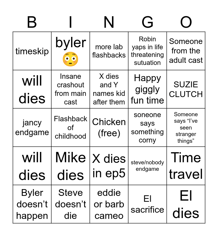This bingo card has a free space and 24 words: Mike dies, Steve doesn’t die, X dies and Y names kid after them, Byler doesn’t happen, Someone from the adult cast, timeskip, will dies, byler 😳, soneone says something corny, X dies in ep5, Happy giggly fun time, jancy endgame, steve/nobody endgame, Time travel, Insane crashout from main cast, El sacrifice, Someone says “I’ve seen stranger things”, more lab flashbacks, SUZIE CLUTCH, Flashback of childhood, El dies, will dies, Robin yaps in life threatening sutuation and eddie or barb cameo.