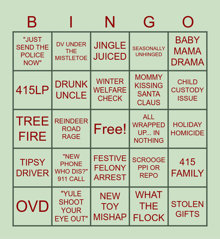 This bingo card has a free space and 44 words: CHILD CALLING 911, STOLEN GIFTS, POLAR EXPRESS, OVD, SUSP VEH, WHAT THE FLOCK, JINGLE JUICED, SUSP SANTA CLAUS, BABY MAMA DRAMA, "YULE SHOOT YOUR EYE OUT", SEASONALLY UNHINGED, ALL WRAPPED UP... IN NOTHING, FESTIVE FELONY ARREST, "NEW PHONE WHO DIS?" 911 CALL, "BAH-HUMBUG" TOW REQUEST, NEW TOY MISHAP, VEH BURG, TREE FIRE, IT'S A CHRISTMAS MIRACLE, CHILD CUSTODY ISSUE, DV UNDER THE MISTLETOE, SHOTH OR FIRE- WORKS, CHRISTMAS CRASH, "JUST SEND THE POLICE NOW", OVEN FIRE, HOLIDAY HOMICIDE, ILLEG PARKED VEHICLE, SILENT NIGHT 10-33, SCROOGE PPI OR REPO, TIPSY DRIVER, GRINCH CALLER, 415 FAMILY, GRANDMA GOT RUN OVER BY A REINDEER, "SANTA" SAID ON RADIO, REINDEER ROAD RAGE, HOLLY JOLLY THEFT, LOOSE DOG, HOME ALONE, WINTER WELFARE CHECK, 415LP, MOMMY KISSING SANTA CLAUS, POWER OUTAGE, DRUNK UNCLE and THE WEATHER OUTSIDE IS FRIGHTFUL.