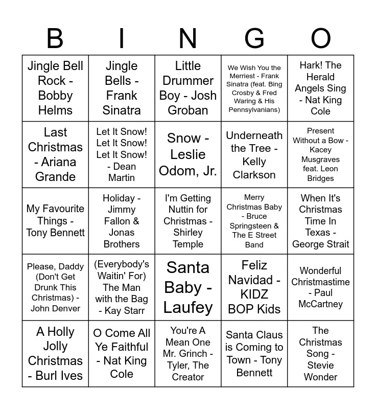 This bingo card has 50 words: Have Yourself a Merry Little Christmas - Judy Garland, I'm Getting Nuttin for Christmas - Shirley Temple, Sleigh Ride - Idina Menzel, You're A Mean One Mr. Grinch - Tyler, The Creator, (Everybody's Waitin' For) The Man with the Bag - Kay Starr, Merry Christmas - Ed Sheeran & Elton John, Jingle Bells - Frank Sinatra, Up on the Housetop - Gene Autry, Last Christmas - Ariana Grande, (I'd Like to Spend) Christmas with Santa - Dolly Parton, Let It Snow! Let It Snow! Let It Snow! - Dean Martin, We Wish You the Merriest - Frank Sinatra (feat. Bing Crosby & Fred Waring & His Pennsylvanians), Wonderful Christmastime - Paul McCartney, Feliz Navidad - KIDZ BOP Kids, We Need a Little Christmas - Percy Faith, One More Sleep - Leona Lewis, Snow - Leslie Odom, Jr., Merry Christmas Baby - Bruce Springsteen & The E Street Band, We Three Kings - We Are Messengers, Hark! The Herald Angels Sing - Nat King Cole, Holiday - Jimmy Fallon & Jonas Brothers, Santa Claus is Coming to Town - Tony Bennett, Jingle Bell Rock - Bobby Helms, Underneath the Tree - Kelly Clarkson, It Came Upon a Midnight Clear - Carpenters, The Christmas Song - Stevie Wonder, Present Without a Bow - Kacey Musgraves feat. Leon Bridges, Someday at Christmas - Jackson 5, Little Drummer Boy - Josh Groban, Santa Baby - Laufey, Carol of the Bells - John Williams, The Secret of Christmas - Ella Fitzgerald, Christmas Night in Harlem - Louis Armstrong, Christmas In Hollis - Run-DMC, O Come All Ye Faithful - Nat King Cole, Frosty the Snowman - Fiona Apple, Do You Hear What I Hear? - Andrea Bocelli, Matteo Bocelli & Virginia Bocelli feat. Pentatonix, Shake Hands With Santa Claus - Louis Prima, Christmas (Baby Please Come Home) - U2, When It's Christmas Time In Texas - George Strait, Candy Cane Lane - Sia, Merry Christmas, Happy Holidays - *NSYNC, Sleigh Ride - The Ronettes, Blue Christmas - Elvis Presley & Kane Brown, A Holly Jolly Christmas - Burl Ives, My Favourite Things - Tony Bennett, Winter Wonderland - Aretha Franklin, (There's No Place Like) Home for the Holidays - Perry Como, Please, Daddy (Don't Get Drunk This Christmas) - John Denver and Santa Claus Got Stuck (In My Chimney) - Ella Fitzgerald feat. The Ink Spots.