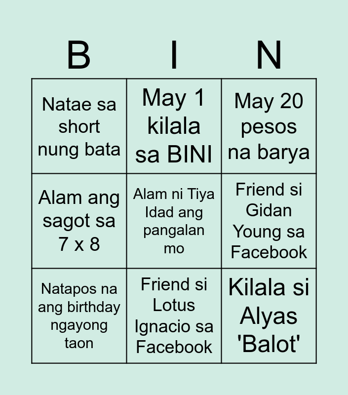 This bingo card has a free space and 28 words: Kilala si Alyas 'Badgets', May salamin sa mata, Kumain na ng kanin, May alagang hayop sa bahay, Friend si Gidan Young sa Facebook, May 20 pesos na barya, May 1 kilala sa BINI, May suot na hikaw, Alam ang Tagalog ng reunion, May TikTok sa cellphone, May suot na bra, Alam ang sagot sa 7 x 8, May bungi, Nakasuot ng brief, May letter E sa buong pangalan, Naka white na damit, Alam ang sagot sa 2 + 2, Natapos na ang birthday ngayong taon, Friend si Lotus Ignacio sa Facebook, Nakasuot ng tsinelas, Natae sa short nung bata, May cellphone, May 10 pesos na puro piso, Humihilik ang Tatay mo, May picture niya sa Profile Picture sa FB, May puting buhok, Kilala si Alyas 'Balot' and May letter A sa buong pangalan.