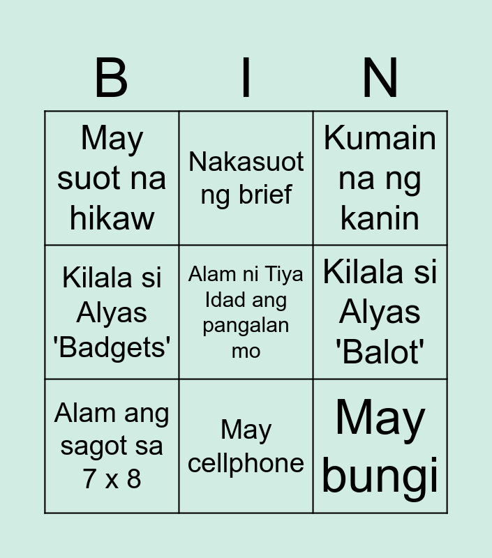 This bingo card has a free space and 28 words: Natapos na ang birthday ngayong taon, May 20 pesos na barya, May salamin sa mata, Natae sa short nung bata, Kilala si Alyas 'Balot', Kumain na ng kanin, Nakasuot ng brief, May suot na bra, May 10 pesos na puro piso, Friend si Gidan Young sa Facebook, May letter A sa buong pangalan, Kilala si Alyas 'Badgets', May picture niya sa Profile Picture sa FB, Humihilik ang Tatay mo, May letter E sa buong pangalan, Alam ang Tagalog ng reunion, Alam ang sagot sa 2 + 2, Alam ang sagot sa 7 x 8, May cellphone, May alagang hayop sa bahay, May suot na hikaw, Naka white na damit, Friend si Lotus Ignacio sa Facebook, May 1 kilala sa BINI, Nakasuot ng tsinelas, May TikTok sa cellphone, May bungi and May puting buhok.
