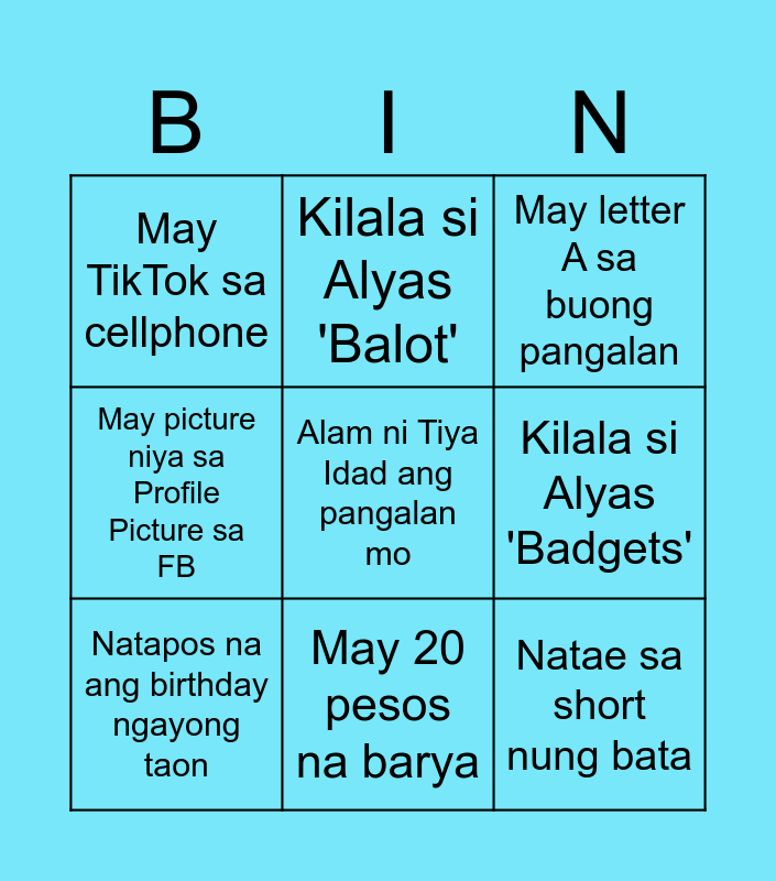 This bingo card has a free space and 28 words: Nakasuot ng brief, May salamin sa mata, May puting buhok, May bungi, Kilala si Alyas 'Badgets', May letter A sa buong pangalan, Kilala si Alyas 'Balot', May letter E sa buong pangalan, Alam ang Tagalog ng reunion, May 1 kilala sa BINI, May alagang hayop sa bahay, May picture niya sa Profile Picture sa FB, Naka white na damit, Nakasuot ng tsinelas, May 10 pesos na puro piso, May cellphone, May suot na bra, Natapos na ang birthday ngayong taon, May 20 pesos na barya, Humihilik ang Tatay mo, May TikTok sa cellphone, Kumain na ng kanin, May suot na hikaw, Friend si Lotus Ignacio sa Facebook, Friend si Gidan Young sa Facebook, Alam ang sagot sa 2 + 2, Natae sa short nung bata and Alam ang sagot sa 7 x 8.