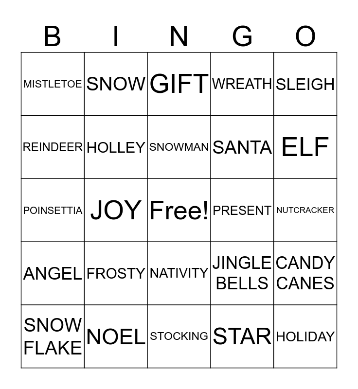 This bingo card has a free space and 28 words: CANDY CANES, CHRISTMAS TREE, SANTA, STAR, REINDEER, GIFT, SNOW, ANGEL, PRESENT, SNOW FLAKE, POINSETTIA, WREATH, NOEL, STOCKING, ELF, MERRY CHRISTMAS, FROSTY, HOLLEY, SNOWMAN, NATIVITY, MISTLETOE, ORNAMENTS, HOLIDAY, JOY, NUTCRACKER, JINGLE BELLS, SLEIGH and TINSEL.