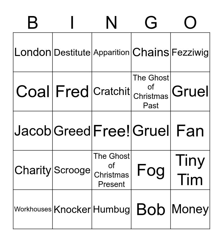 This bingo card has a free space and 24 words: Scrooge, Knocker, Cratchit, Workhouses, Fezziwig, London, Coal, Destitute, Gruel, The Ghost of Christmas Present, The Ghost of Christmas Past, Jacob, Fog, Tiny Tim, Fred, Bob, Fan, Apparition, Gruel, Greed, Money, Charity, Chains and Humbug.