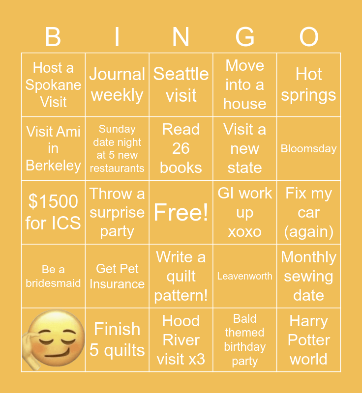 This bingo card has 1 images, a free space and 23 words: Get Pet Insurance, Finish 5 quilts, Read 26 books, Hot springs, Host a Spokane Visit, Visit Ami in Berkeley, Journal weekly, GI work up xoxo, Write a quilt pattern!, Visit a new state, $1500 for ICS, Leavenworth, Monthly sewing date, Sunday date night at 5 new restaurants, Bald themed birthday party, Fix my car (again), Seattle visit, Bloomsday, Throw a surprise party, Harry Potter world, Be a bridesmaid, Move into a house and Hood River visit x3.