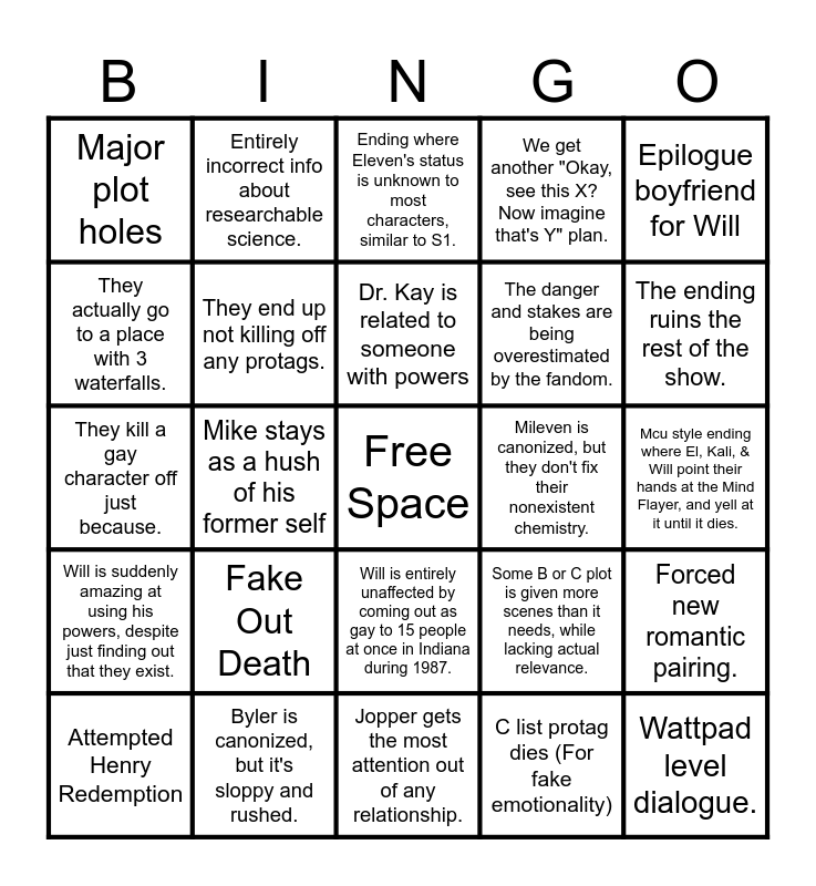 This bingo card has a free space and 24 words: Attempted Henry Redemption, Fake Out Death, Dr. Kay is related to someone with powers, C list protag dies (For fake emotionality), Epilogue boyfriend for Will, Major plot holes, Entirely incorrect info about researchable science., Ending where Eleven's status is unknown to most characters, similar to S1., Mileven is canonized, but they don't fix their nonexistent chemistry., Mcu style ending where El, Kali, & Will point their hands at the Mind Flayer, and yell at it until it dies., They kill a gay character off just because., They end up not killing off any protags., Some B or C plot is given more scenes than it needs, while lacking actual relevance., Forced new romantic pairing., They actually go to a place with 3 waterfalls., Byler is canonized, but it's sloppy and rushed., Jopper gets the most attention out of any relationship., We get another "Okay, see this X? Now imagine that's Y" plan., The ending ruins the rest of the show., Will is suddenly amazing at using his powers, despite just finding out that they exist., Mike stays as a hush of his former self, Will is entirely unaffected by coming out as gay to 15 people at once in Indiana during 1987., The danger and stakes are being overestimated by the fandom. and Wattpad level dialogue..