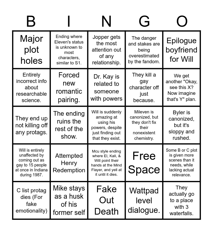 This bingo card has 25 words: Attempted Henry Redemption, Fake Out Death, Dr. Kay is related to someone with powers, C list protag dies (For fake emotionality), Epilogue boyfriend for Will, Major plot holes, Entirely incorrect info about researchable science., Ending where Eleven's status is unknown to most characters, similar to S1., Mileven is canonized, but they don't fix their nonexistent chemistry., Mcu style ending where El, Kali, & Will point their hands at the Mind Flayer, and yell at it until it dies., They kill a gay character off just because., They end up not killing off any protags., Free Space, Some B or C plot is given more scenes than it needs, while lacking actual relevance., Forced new romantic pairing., They actually go to a place with 3 waterfalls., Byler is canonized, but it's sloppy and rushed., Jopper gets the most attention out of any relationship., We get another "Okay, see this X? Now imagine that's Y" plan., The ending ruins the rest of the show., Will is suddenly amazing at using his powers, despite just finding out that they exist., Mike stays as a husk of his former self, Will is entirely unaffected by coming out as gay to 15 people at once in Indiana during 1987., The danger and stakes are being overestimated by the fandom. and Wattpad level dialogue..