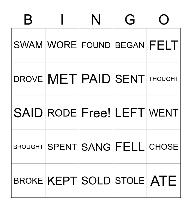 This bingo card has a free space and 48 words: CAUGHT, ATE, HEARD, SOLD, SPENT, TOOK, WORE, WON, DROVE, FORGOT, MET, BEGAN, CHOSE, FELL, FROZE, HELD, PAID, LEFT, TOLD, FELT, RODE, STOLE, SWAM, SENT, STOOD, THOUGHT, BROKE, CAME, SANG, BROUGHT, DREW, FOUGHT, GAVE, LOST, KEPT, BUILT, FLEW, WENT, SLEPT, RAN, SAT, DRANK, FOUND, MADE, SAID, BOUGHT, HAD and LEARNT.