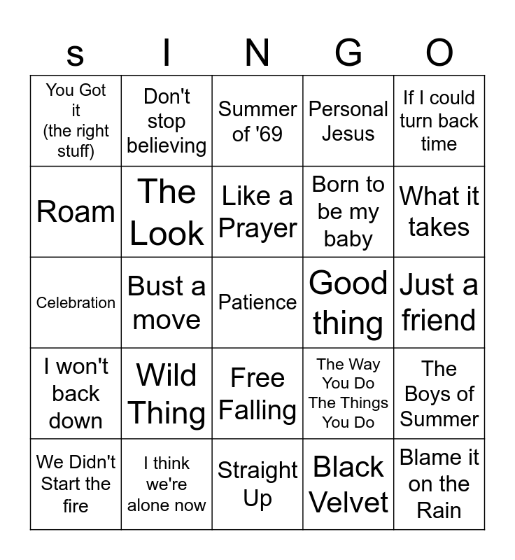 This bingo card has a free space and 39 words: She Drives Me Crazy, Paradise City, If you don't know me by now, The Look, We Didn't Start the fire, Free Falling, Like a Prayer, Love Shack, If I could turn back time, I won't back down, Bust a move, Personal Jesus, Blame it on the Rain, Just a friend, Good thing, Wild Thing, Pump up the Jam, You Got it (the right stuff), Dangerous, The Way You Do The Things You Do, Roam, Straight Up, Born to be my baby, What it takes, Stand, What I am, Waiting on a star to fall, Smooth Criminal, Blister in the Sun, Don't stop believing, I still haven't found what I'm Looking For, Down Under, Summer of '69, I think we're alone now, Black Velvet, Kiss, The Boys of Summer, Celebration and Raspberry Beret.