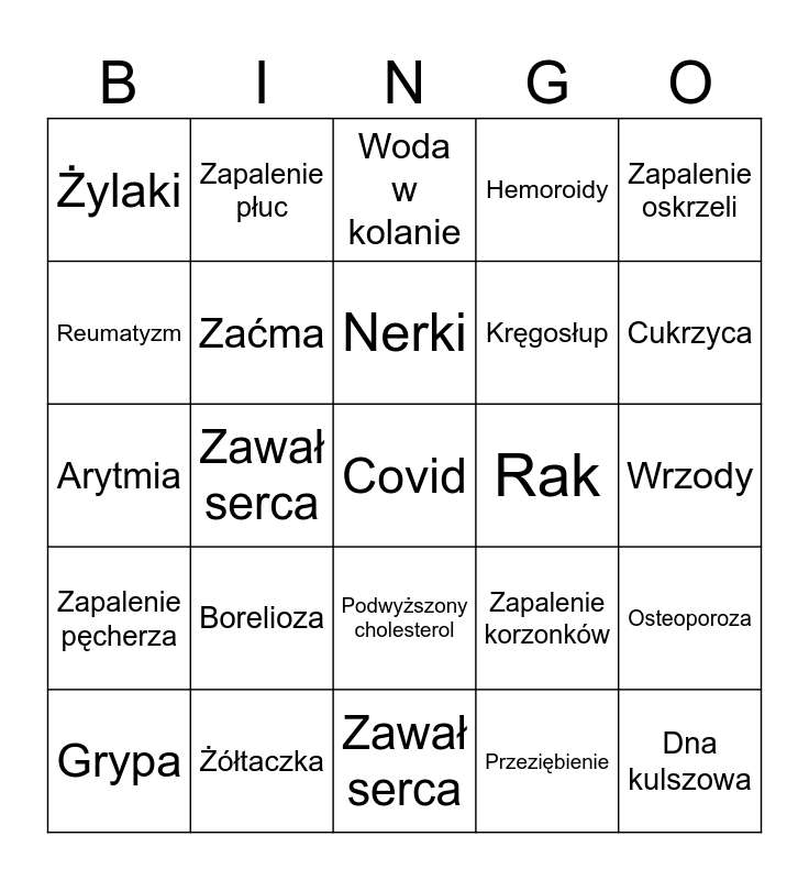 This bingo card has a free space and 24 words: Borelioza, Żółtaczka, Nerki, Grypa, Zapalenie oskrzeli, Żylaki, Reumatyzm, Zapalenie płuc, Rak, Podwyższony cholesterol, Kręgosłup, Arytmia, Zapalenie korzonków, Osteoporoza, Zaćma, Przeziębienie, Wrzody, Woda w kolanie, Cukrzyca, Zawał serca, Dna kulszowa, Zapalenie pęcherza, Hemoroidy and Zawał serca.