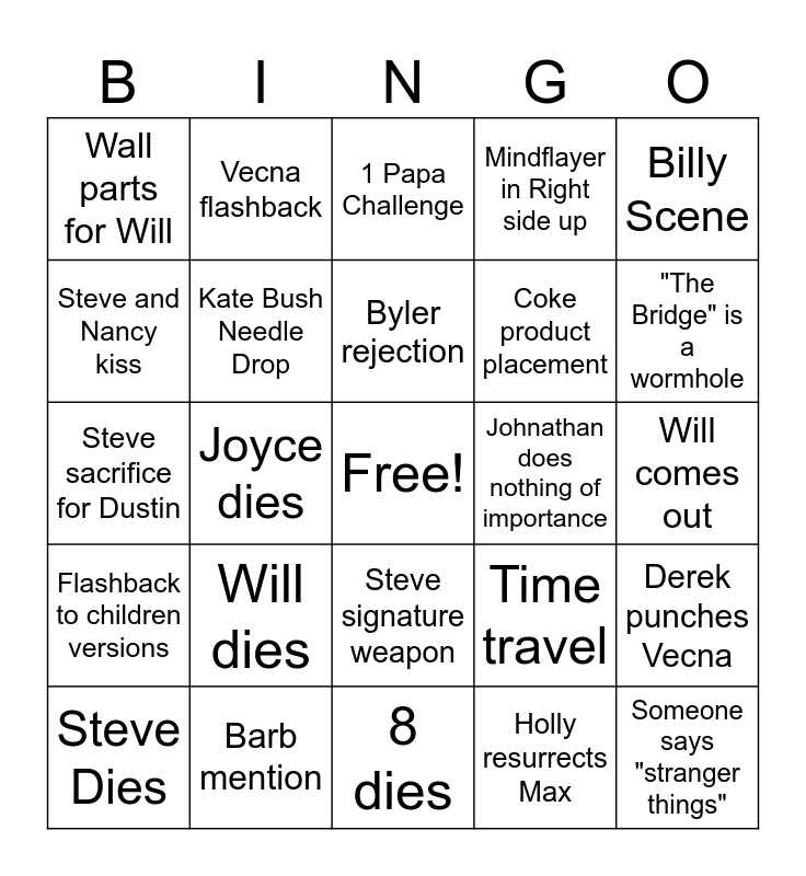 This bingo card has a free space and 24 words: Steve Dies, Will dies, Byler rejection, Holly resurrects Max, Billy Scene, Wall parts for Will, Vecna flashback, 1 Papa Challenge, Johnathan does nothing of importance, Will comes out, Steve sacrifice for Dustin, Kate Bush Needle Drop, Time travel, Derek punches Vecna, Steve and Nancy kiss, Barb mention, 8 dies, Mindflayer in Right side up, "The Bridge" is a wormhole, Flashback to children versions, Joyce dies, Steve signature weapon, Coke product placement and Someone says "stranger things".