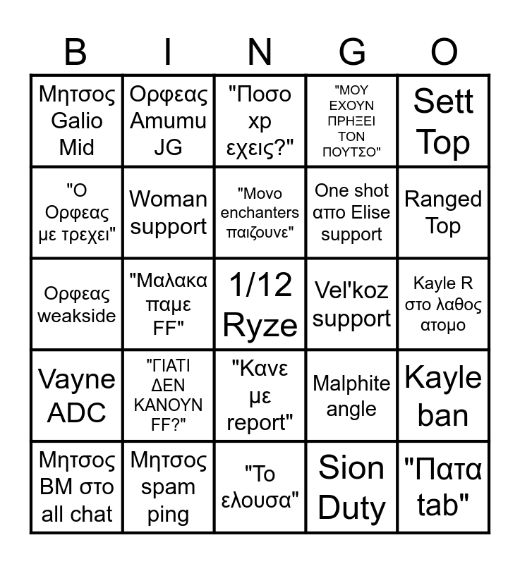 This bingo card has a free space and 24 words: "ΓΙΑΤΙ ΔΕΝ ΚΑΝΟΥΝ FF?", Μητσος spam ping, "Μονο enchanters παιζουνε", Μητσος BM στο all chat, Sett Top, Μητσος Galio Mid, "Ο Ορφεας με τρεχει", Ορφεας Amumu JG, Vel'koz support, "Κανε με report", One shot απο Elise support, Ορφεας weakside, Malphite angle, Kayle ban, Woman support, Sion Duty, Kayle R στο λαθος ατομο, "Ποσο xp εχεις?", Ranged Top, "Μαλακα παμε FF", "Πατα tab", Vayne ADC, "ΜΟΥ ΕΧΟΥΝ ΠΡΗΞΕΙ ΤΟΝ ΠΟΥΤΣΟ" and "Το ελουσα".