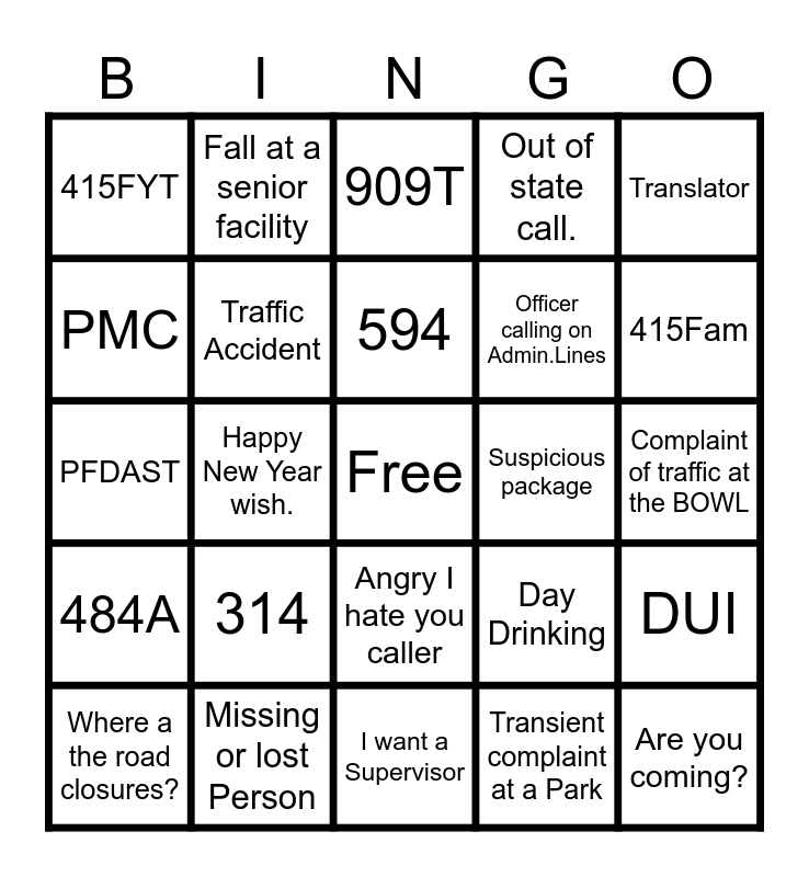 This bingo card has a free space and 24 words: 314, Missing or lost Person, 594, Where a the road closures?, Translator, 415FYT, PMC, Fall at a senior facility, Suspicious package, Angry I hate you caller, Officer calling on Admin.Lines, PFDAST, Day Drinking, DUI, Traffic Accident, Transient complaint at a Park, Complaint of traffic at the BOWL, 909T, 415Fam, Happy New Year wish., Are you coming?, 484A, Out of state call. and I want a Supervisor.