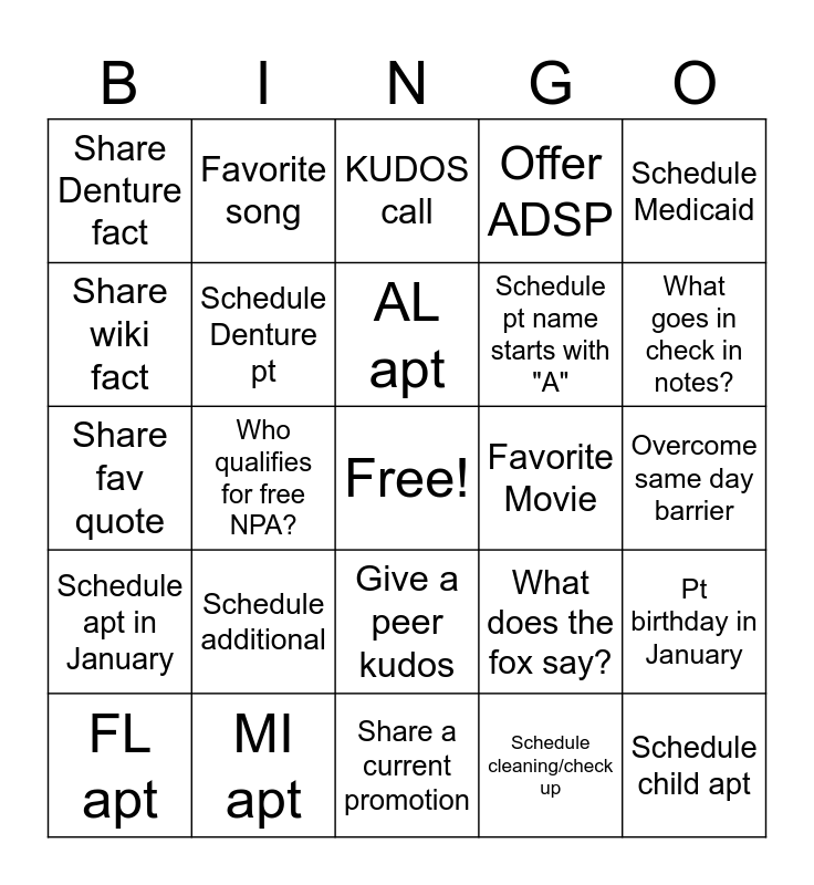 This bingo card has a free space and 24 words: Schedule additional, MI apt, AL apt, FL apt, Schedule Medicaid, Share Denture fact, Share wiki fact, Favorite song, Favorite Movie, Give a peer kudos, Schedule pt name starts with "A", Share fav quote, What does the fox say?, Pt birthday in January, Schedule Denture pt, Schedule cleaning/check up, Overcome same day barrier, KUDOS call, What goes in check in notes?, Who qualifies for free NPA?, Schedule child apt, Schedule apt in January, Offer ADSP and Share a current promotion.