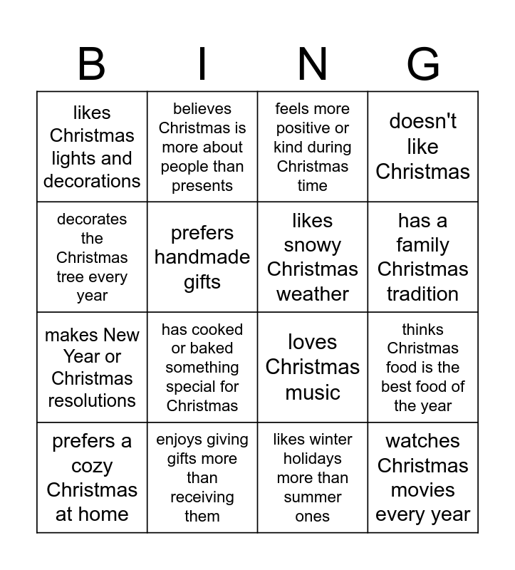 This bingo card has 16 words: enjoys giving gifts more than receiving them, thinks Christmas food is the best food of the year, feels more positive or kind during Christmas time, likes Christmas lights and decorations, makes New Year or Christmas resolutions, believes Christmas is more about people than presents, loves Christmas music, likes winter holidays more than summer ones, decorates the Christmas tree every year, prefers handmade gifts, prefers a cozy Christmas at home, doesn't like Christmas, has cooked or baked something special for Christmas, has a family Christmas tradition, likes snowy Christmas weather and watches Christmas movies every year.