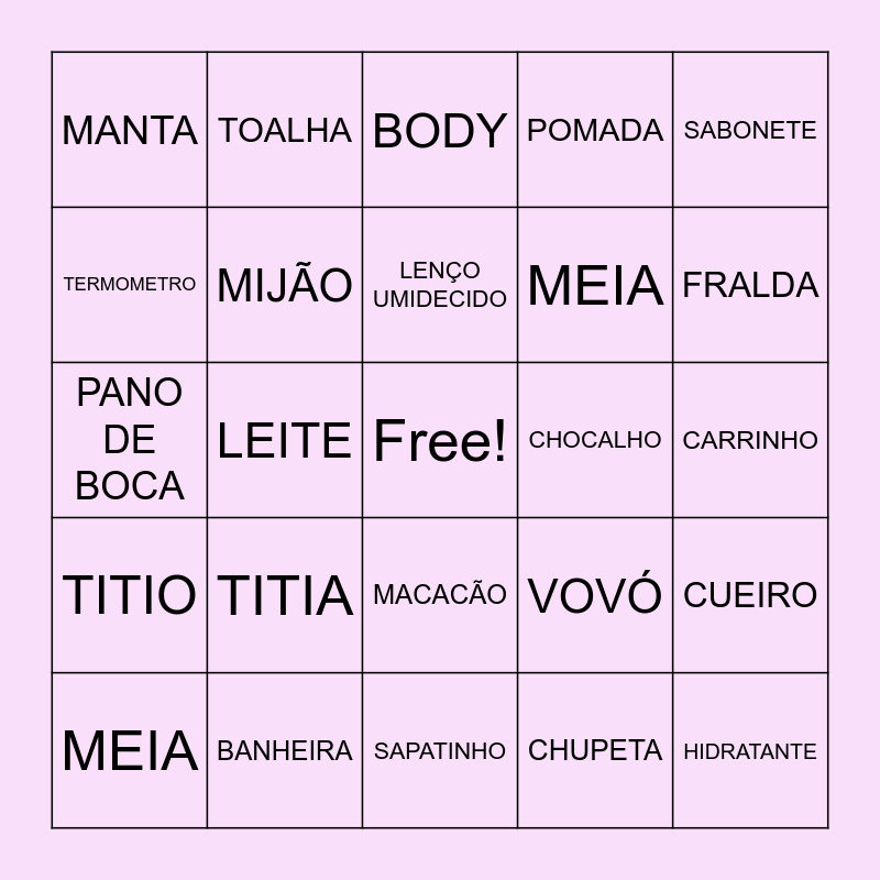 This bingo card has a free space and 30 words: BANHEIRA, BABADOR, LEITE, MORDEDOR, MANTA, BODY, MIJÃO, MACACÃO, CHOCALHO, SAPATINHO, CARRINHO, HIDRATANTE, CHUPETA, MAMADEIRA, FRALDA, VOVÔ, VOVÓ, TITIO, TITIA, SABONETE, PANO DE BOCA, TROCADOR, TOALHA, MEIA, TERMOMETRO, POMADA, CUEIRO, MEIA, LENÇO UMIDECIDO and ESCOVINHA DE CABELO.
