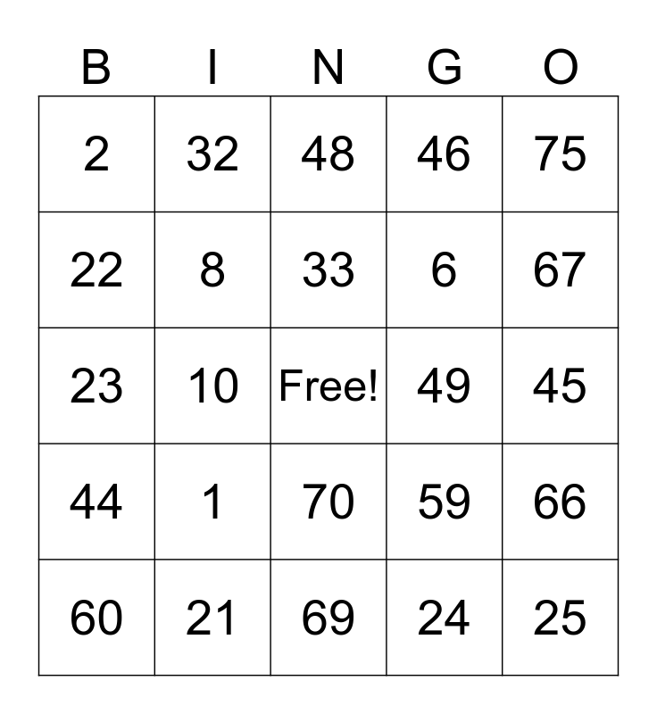 This bingo card has a free space and 24 words: 1, 21, 33, 60, 75, 2, 22, 32, 49, 70, 6, 23, 59, 66, 8, 24, 45, 48, 67, 10, 25, 44, 46 and 69.