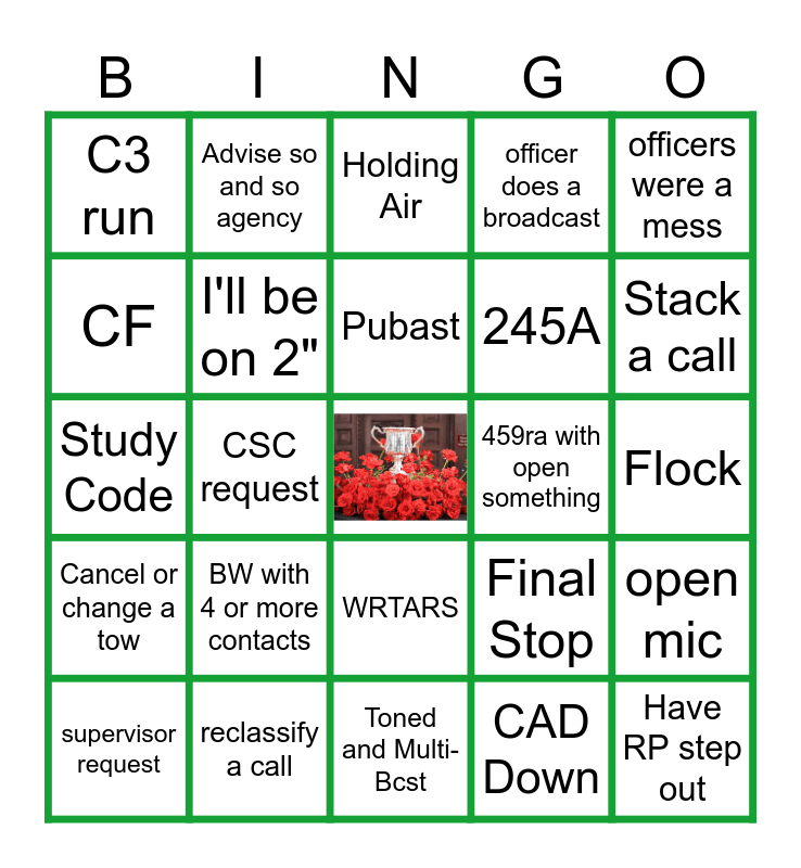 This bingo card has a free space and 24 words: BW with 4 or more contacts, reclassify a call, Pubast, supervisor request, officers were a mess, C3 run, CF, Advise so and so agency, 459ra with open something, WRTARS, 245A, Study Code, Final Stop, open mic, I'll be on 2", CAD Down, Flock, Holding Air, Stack a call, CSC request, Have RP step out, Cancel or change a tow, officer does a broadcast and Toned and Multi-Bcst.