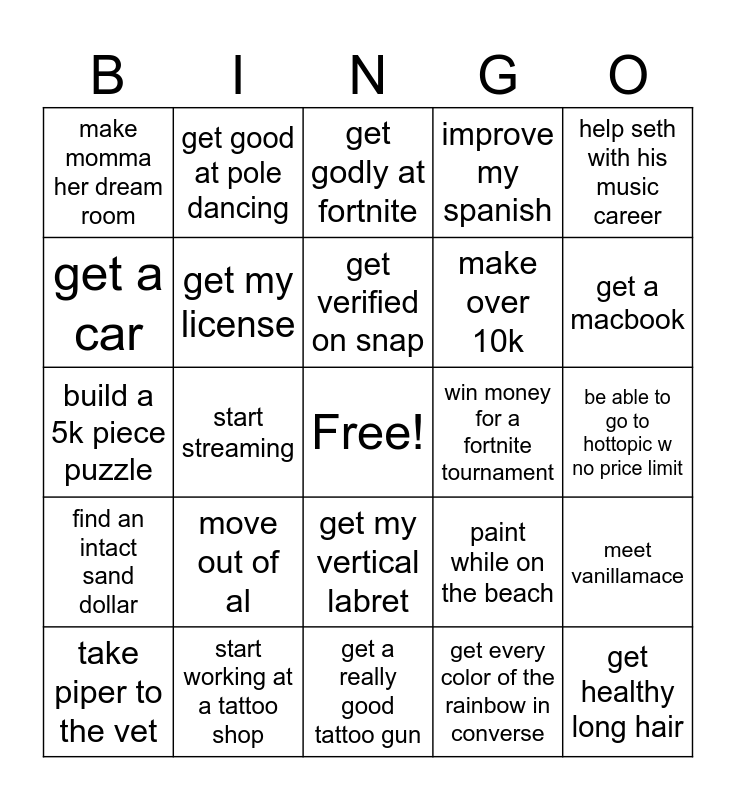 This bingo card has a free space and 24 words: move out of al, start working at a tattoo shop, get verified on snap, take piper to the vet, help seth with his music career, make momma her dream room, get a car, get good at pole dancing, win money for a fortnite tournament, get my vertical labret, make over 10k, build a 5k piece puzzle, paint while on the beach, meet vanillamace, get my license, get every color of the rainbow in converse, be able to go to hottopic w no price limit, get godly at fortnite, get a macbook, start streaming, get healthy long hair, find an intact sand dollar, improve my spanish and get a really good tattoo gun.