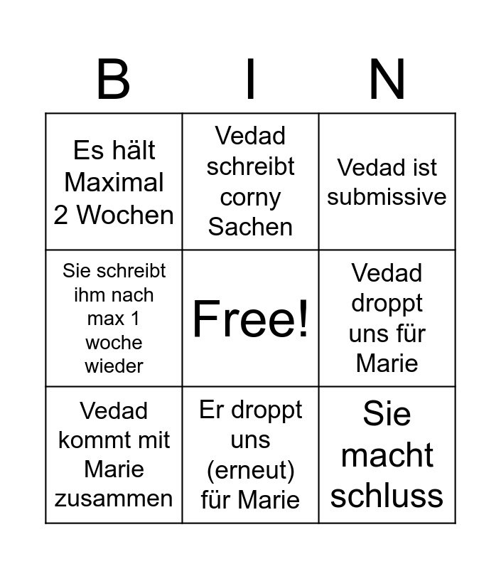 This bingo card has a free space and 8 words: Vedad droppt uns für Marie, Vedad ist submissive, Vedad schreibt corny Sachen, Vedad kommt mit Marie zusammen, Es hält Maximal 2 Wochen, Sie macht schluss, Sie schreibt ihm nach max 1 woche wieder and Er droppt uns (erneut) für Marie.