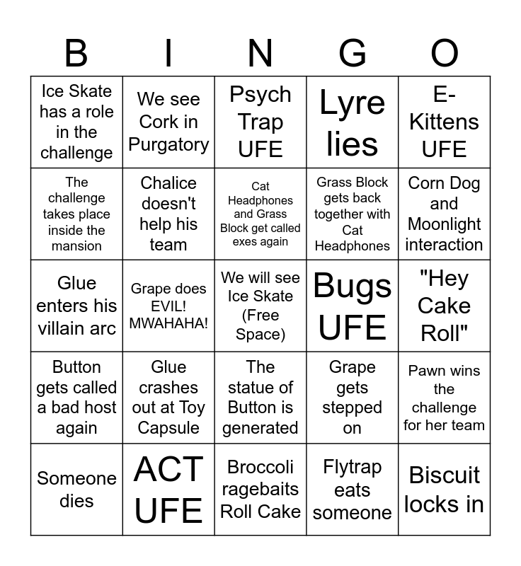 This bingo card has a free space and 24 words: Glue crashes out at Toy Capsule, ACT UFE, Cat Headphones and Grass Block get called exes again, Someone dies, E-Kittens UFE, Ice Skate has a role in the challenge, The challenge takes place inside the mansion, We see Cork in Purgatory, Bugs UFE, The statue of Button is generated, Grass Block gets back together with Cat Headphones, Glue enters his villain arc, Grape gets stepped on, Pawn wins the challenge for her team, Chalice doesn't help his team, Flytrap eats someone, "Hey Cake Roll", Psych Trap UFE, Corn Dog and Moonlight interaction, Grape does EVIL! MWAHAHA!, Biscuit locks in, Button gets called a bad host again, Lyre lies and Broccoli ragebaits Roll Cake.