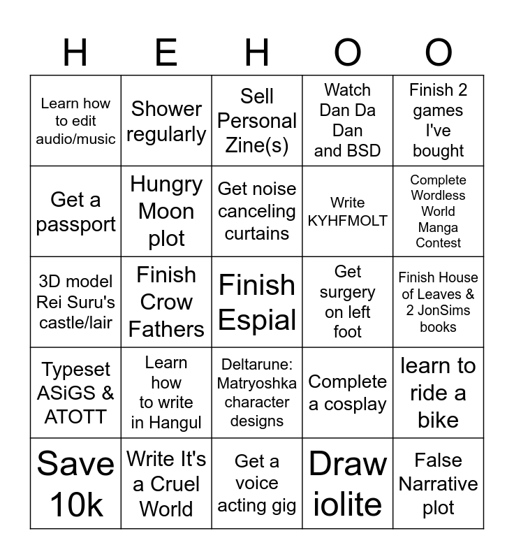 This bingo card has 25 words: Learn how to write in Hangul, Get a voice acting gig, Get noise canceling curtains, Save 10k, Finish 2 games I've bought, Learn how to edit audio/music, Get a passport, Shower regularly, Get surgery on left foot, Deltarune: Matryoshka character designs, Write KYHFMOLT, 3D model Rei Suru's castle/lair, Complete a cosplay, learn to ride a bike, Hungry Moon plot, False Narrative plot, Finish House of Leaves & 2 JonSims books, Sell Personal Zine(s), Complete Wordless World Manga Contest, Finish Crow Fathers, Finish Espial, Write It's a Cruel World, Typeset ASiGS & ATOTT, Watch Dan Da Dan and BSD and Draw iolite.